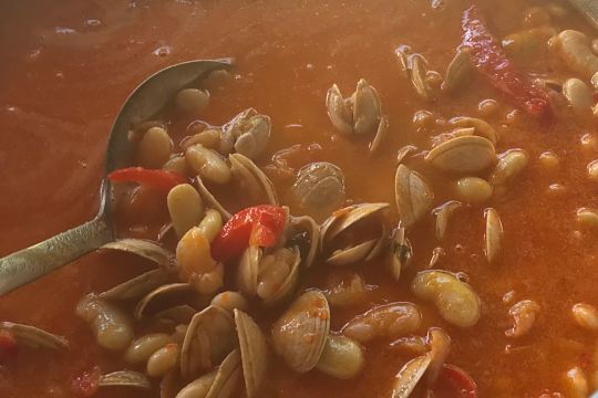 Sí tenemos ya habas frescas de las nuestras. Prueba de ello es esta pota que hemos saboreado con almejas.