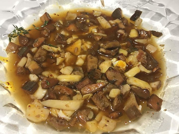 Una vez sentados todos a la mesa, la sensación de abrir la carta y descubrir que lo quieres probar todo es incontrolable, y empeora cuando te cuentan los fuera de carta. En este caso, había que salirse, en otoño las setas son un tesoro y si nos las bañan en un caldo de jamón ibérico hay que abrir el cofre sí o sí.