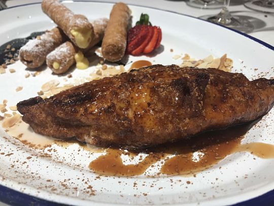 Para rematar la faena, la mejor torrija que jamás he probado. No me canso de repetirlo, y cada vez que la pruebo me reafirmo. Sublime la textura y la sensación que te deja este dulce postre de A Mundiña. En este caso, compartió protagonismo con las habituales cañitas.
